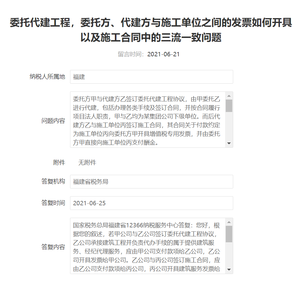 问题内容:委托方甲与代建方乙签订委托代建工程协议,由甲委托乙进行代建,包括办理各类手续及签订合同,并按合同履行项目法人职责,甲与乙均为某集团公司下级单位。而后代建方乙与施工单位丙签订施工合同,其合同关于付款约定为施工单位丙向委托方甲开具增值税专用发票,并由委托方甲直接向施工单位丙支付酬金。