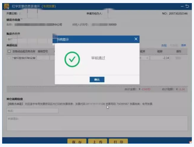 红字发票信息表比对信息无误,系统将提示“审核通过”,点击“确认”即可继续进行负数发票填开。