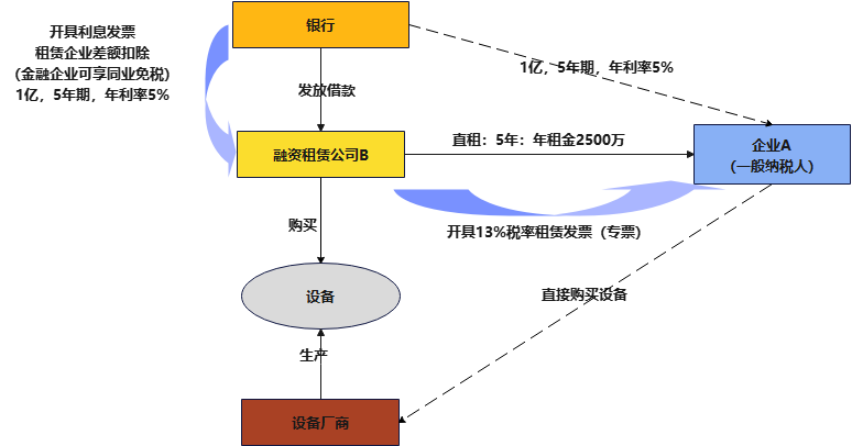 通过对比分析,我们发现,A公司支出同样的现金流,对于增值税,方案一只能抵扣生产线购入的进项税额1150万元,方案二下支付的全部租金(包含本金和利息)均可以抵扣进项税额,对应金额为1438万元,多抵扣的进项税额288万元主要为利息部分对应的税额。这样以来,A公司实际承担的税负下降,对应的资金成本也随之降低,相当于借款利率由5%降低至4.42%((2500万元-288万元)/1亿元)。